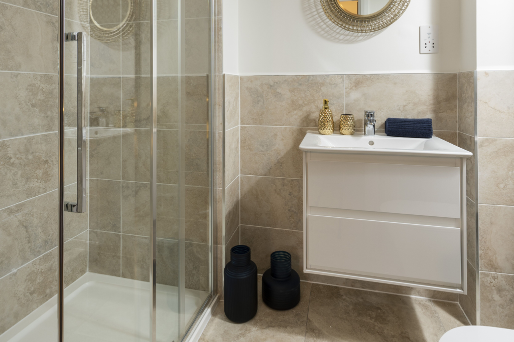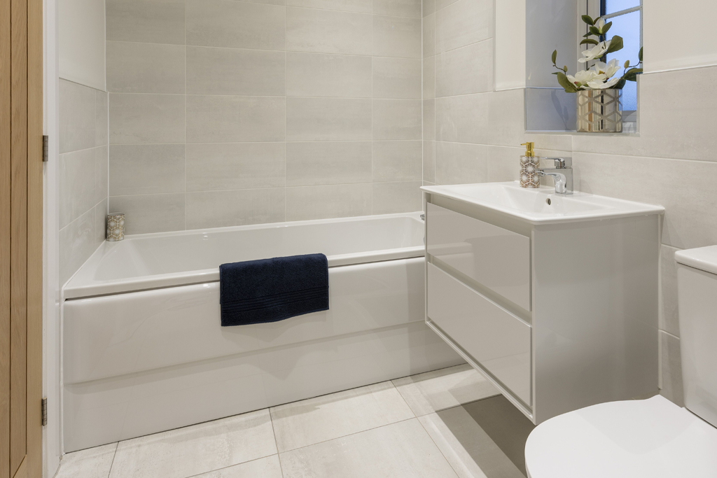- Family bathroom with bath and overhead shower