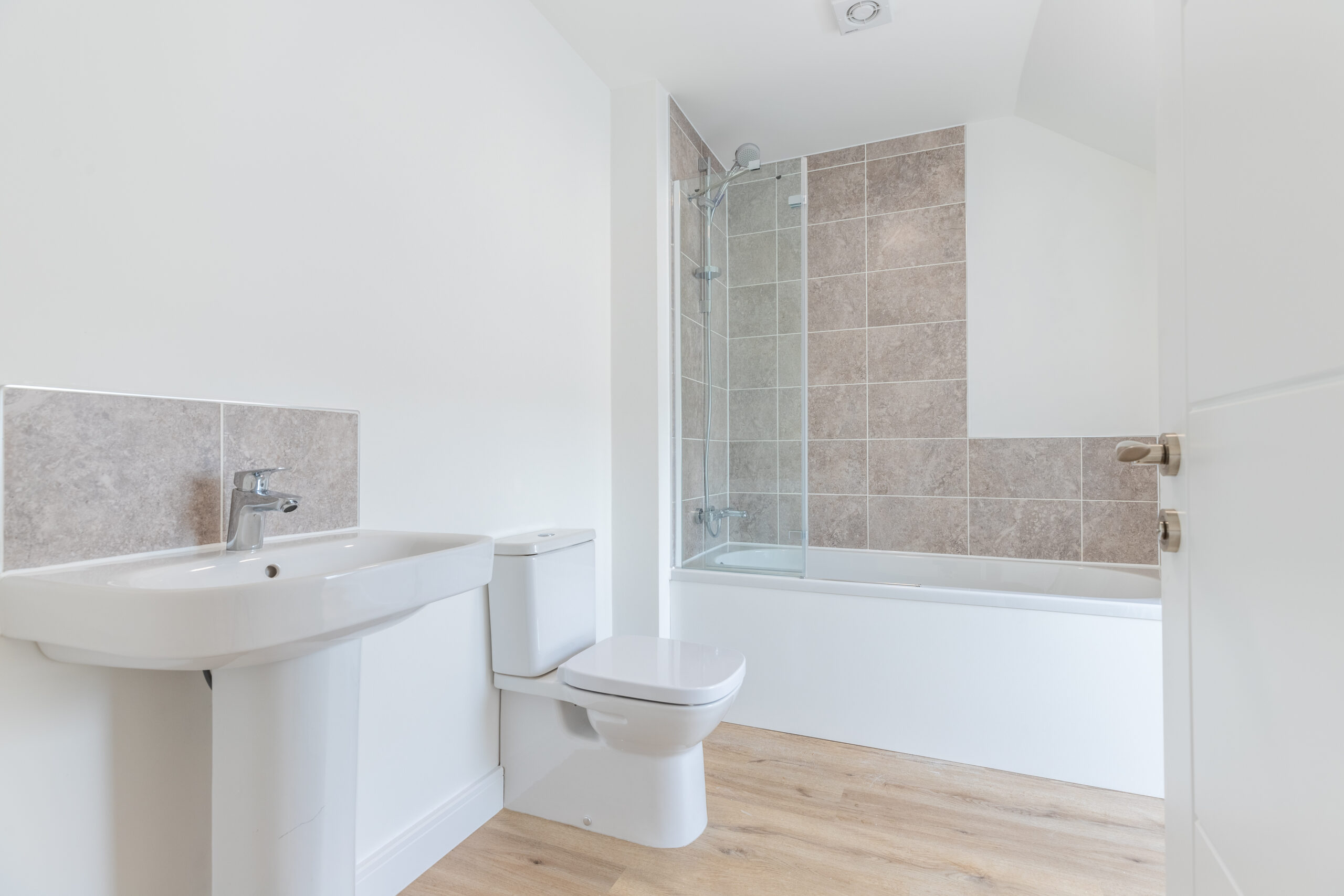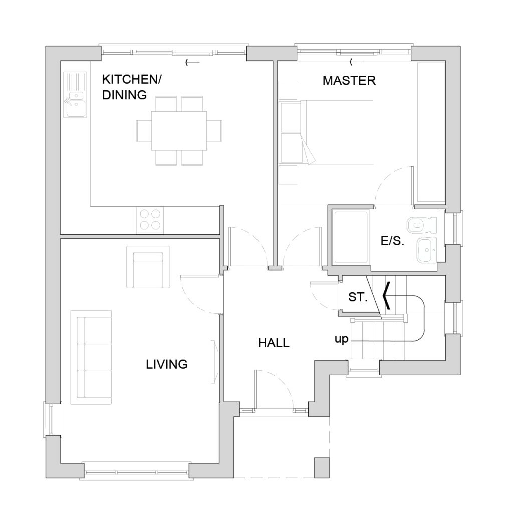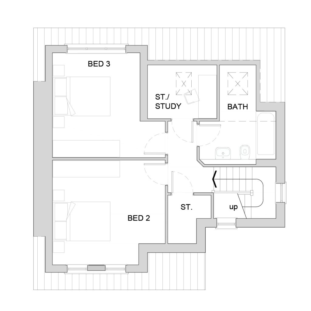 Upstairs there are two spacious bedrooms with large windows as well as a study, family bathroom and a storage cupboard. The generous family bathroom includes modern sanitaryware, your choice of tiling and has the opportunity to add extra storage.