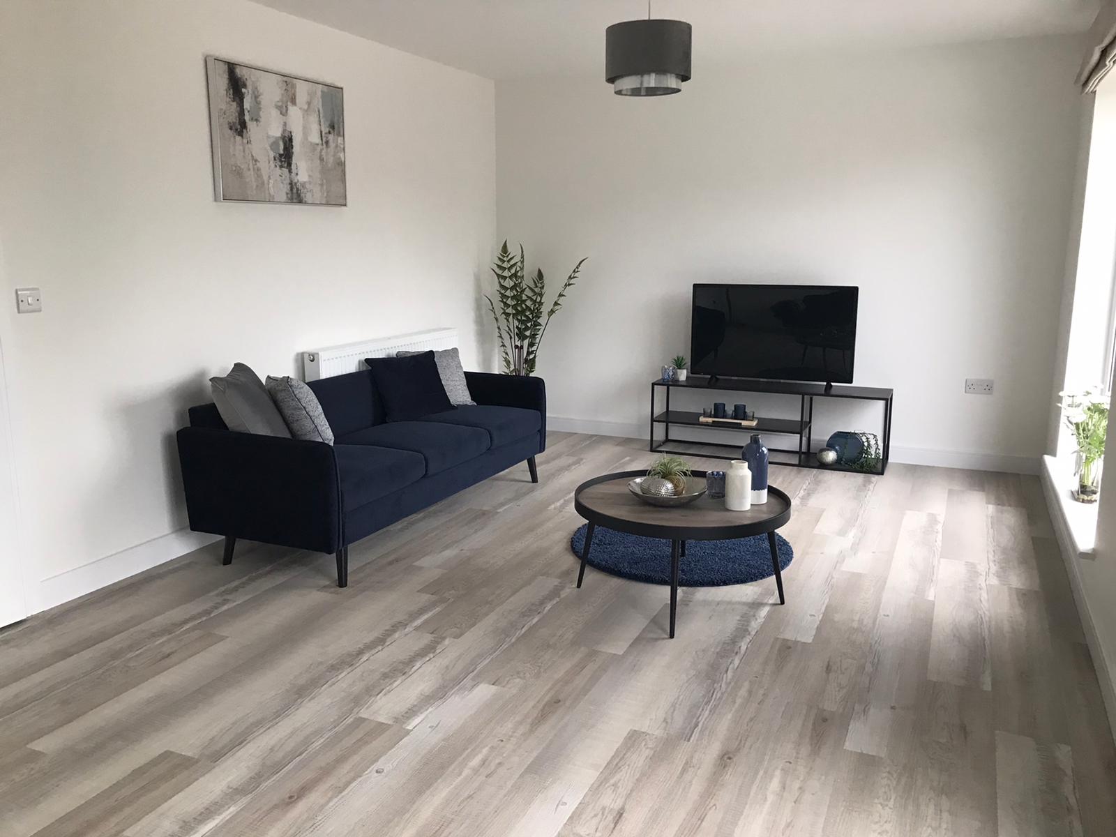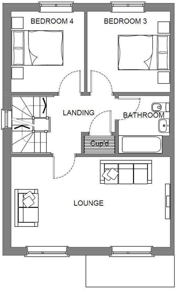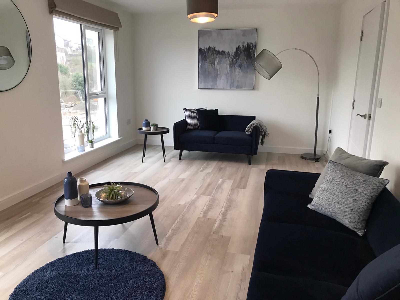 On the first floor is the main living area, spanning the width of the property with two floor to ceiling windows that overlook the front of the home. There are two double bedrooms, a family bathroom and storage cupboard.