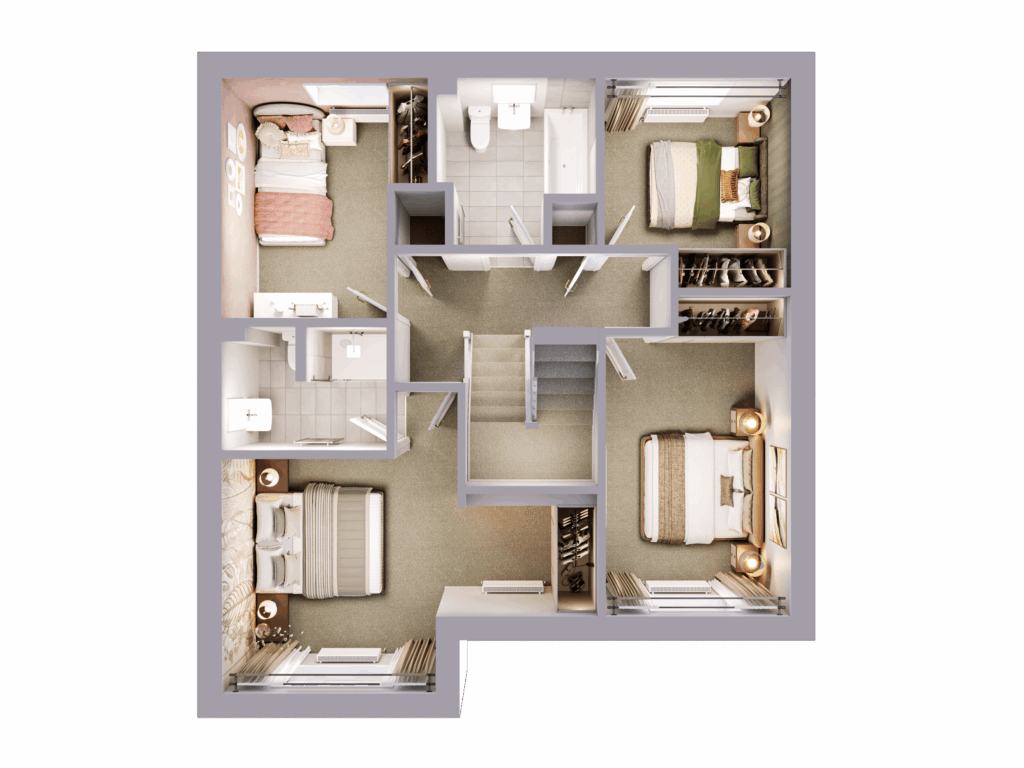 The Whillan is designed with space and functionality in mind, cleverly arranged over three floors. The ground floor boasts an open plan kitchen/dining/family room that spans the entire rear of the property and incorporates a spacious, fully integrated kitchen with appliances as standard. This space is ideal for the hustle and bustle of day-to-day life as well as being a great space for entertaining, with French doors that open into the garden. The kitchen leads to a useful utility room and cloakroom. The Whillan’s comfortable double-aspect lounge fills the room with natural light and a separate study completes the ground floor.